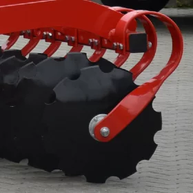 Châssis acier S355, Disques 560mm acier trempé, bore 50 HRC, ressorts indépendants renforcés ype Lemken Heliodor 100x13x10 ; deux rangées de disques – distance entre rangées 90 cm, moyeux sans entretien Agrihub, plaques latérales anti projections réglables, herse peigne 1 rangée, rouleau barre arrière, peinture poudre thermolaquée (peinture allemande FreiLacke qualité Gelcoat).