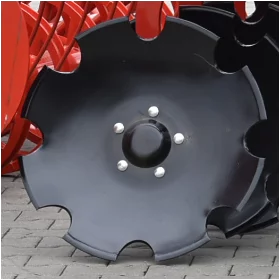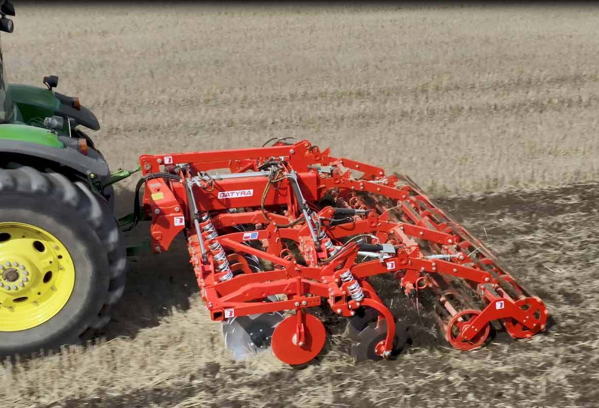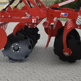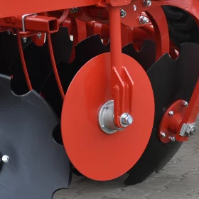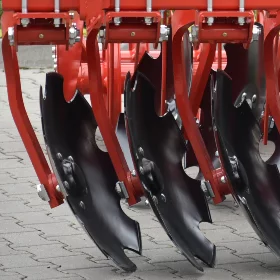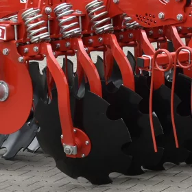Châssis acier S355, Disques 620mm acier trempé, bore 50 HRC, ressorts indépendants renforcés 100x13x10 ; deux rangées de disques – distance entre rangées 90 cm, moyeux sans entretien Agrihub, plaques latérales anti projections réglables, herse peigne 1 rangée, rouleau barre arrière, peinture poudre thermolaquée (peinture allemande FreiLacke qualité Gelcoat).